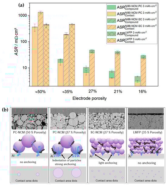(a) Impacts of different electrode porosities from results obtained from 46-point probe electronic resistance measurements. (b) SEM pictures and schematic representations of differences in particle–current collector contact, including the indication of the anchoring of NCM particles into the Al-CC. Please note that the gap between the Al-CC and LMFP coating is an artefact of sample preparation for the cross-section SEM.
