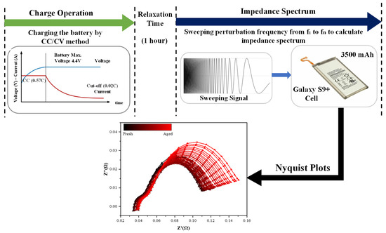 The aging test included LIBs sourced from the Samsung Galaxy S9+ smartphone and subjected to 1000 charge–discharge cycles at 25 °C. Capacity and impedance spectra were recorded every 20 cycles using HYSCLAB environmental chambers (HYSC Co., Ltd., Seoul, Republic of Korea) and WonATech WBCS3000 M2 (WonATech Co., Ltd., Seoul, Republic of Korea) and ZIVE MP2A equipment (WonATech Co., Ltd., Seoul, Republic of Korea). The EIS measurements for the Galaxy S9+ batteries were performed using a 100 mV perturbation in the frequency range of 0.1–4 kHz. The battery specifications are detailed in Table 1, and the aging test conditions are shown in Figure 1. A cylindrical 18650 LIB with a nominal capacity of 2500 mAh and a nominal voltage of 3.7 V was used. The battery was cycled at a constant temperature of 25 °C. Charge–discharge cycles were used with a constant current of 0.5C for both charging and discharging, with a one-hour rest period after each cycle. EIS measurements were conducted every 5 cycles using a 60 mV perturbation in the frequency range of 0.1 Hz to 1 kHz while maintaining the SOC at 100%. The data covered 1035 cycles, continuing until the battery reached its EoL.