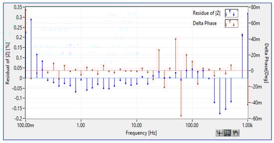 Equations (1) and (2) express the K–K relationships between the real and imaginary components of impedance data, providing a mathematical framework for assessing the internal consistency of the experimental results. Using K–K transforms, we calculate the differences between the actual and calculated values for each data point using Equations (3) and (4). For the EIS data to be reliable, these differences (residuals) for both the real and imaginary parts must be less than 1%.