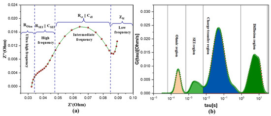 To identify polarization processes within LiBs, it is essential to perform multi-peak fitting and analyze the distribution function, γ(lnτ). This approach breaks down complex signals into simpler components, enabling the differentiation of distinct electrochemical processes. Gaussian functions are frequently employed for fitting due to their simplicity and well-defined physical interpretations [].