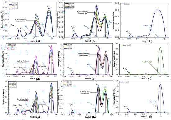 Evolution of DRT plots over the lifecycle for all cells. (a–c) are the DRT results for 18650. (d–f) and (g–i) are the DRT results for two coin cells.