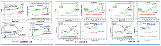 DRT parameter extraction for three kinds of cells. (a) Parameter extraction for the 18650 cell, and (b,c) are the parameters for two coin cells up to their EoL.