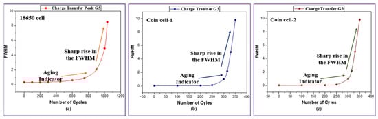 Variation in the FWHM of the G3(τ) peak as the battery cycles towards its EoL. (a) Variation in the FWHM for 18650 cell and (b,c) Variation in FWHM for two coin cells up to their EoL.