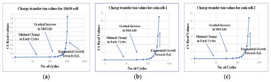Similarly, the charge transfer process steadily increases with aging, indicating slower electrochemical reactions. Initially, there is minimal change in the early cycles, followed by a gradual increase during the midlife of the battery and exponential growth as the battery approaches its EoL, as shown in Figure 8, where the x-axis (number of cycles) is displayed in logarithmic scale. The cycling and aging of the battery cause degradation of the electrode materials, including structural changes, particle cracking, and the Loss of Active Material (LAM) []. This degradation reduces both electronic and ionic conductivity at the electrode–electrolyte interface, leading to an increase in charge transfer resistance.