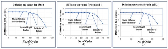 Variation in the center relaxation time of the G4(τ) peak as the battery cycles towards its EoL. (a) Variation in the tau for 18650 cell and (b,c) Variation in tau for two coin cells up to their EoL.