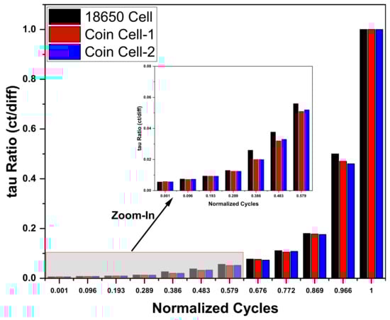 Analysis of the ratios for all three cells revealed a consistent pattern, with bar graphs shown in Figure 10, illustrating low variation in the ‘tau’ ratios, which are very close to each other. Among all of the parameters extracted from the DRT analysis, only the tau ratio exhibits a consistent trend across all cells. This trend is expected because as the battery undergoes repeated cycling, the charge transfer process shifts towards higher relaxation times, indicating a slowdown in the process due to the LLI in the battery. This phenomenon is consistently observed in all LIBs, making the tau ratio a critical parameter for evaluating battery status.