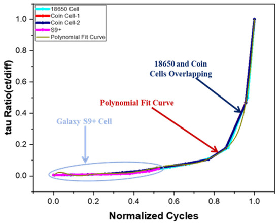 To evaluate the status of a LIB, the ‘tau’ ratio is calculated from the DRT plots and plotted onto the same graph. For verification in this study, Samsung Galaxy S9+ battery data was analyzed, and its transformation into the DRT is shown in Figure 12. The ‘tau’ ratio graph for the Samsung Galaxy S9+ battery aligned closely with the main ‘tau’ ratio graph up to its midpoint, indicating that the battery had completed approximately half of its life, which was 1000 cycles. By analyzing this segment of the graph, it was concluded that approximately half of the battery’s health or lifespan had been depleted. Based on these findings, it was estimated that the Samsung Galaxy S9+ battery would require an additional 1100 cycles to reach its EoL, giving it a total lifespan of approximately 2100 cycles. This approach illustrates that by generating a DRT plot for any LIB, its current status can be accurately assessed without depending on historical data. Furthermore, the total lifespan of the battery can be predicted using the ‘tau’ ratio parameter, providing valuable insights into battery performance and longevity.