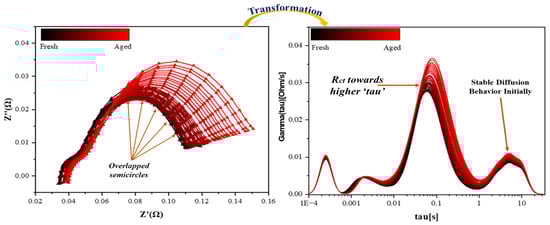 Here, the FWHM indicates how the time constants are distributed for a process. Narrow peaks show specific and uniform processes, while broad peaks suggest a wider range of complex processes []. The peak area reflects how much a process contributes to the overall impedance, with larger areas indicating a greater role. Peak height represents the intensity of a process, where higher peaks mean a more pronounced electrochemical process. Lastly, the center relaxation time (τ) indicates the speed of a process, with lower ‘τ’ values linked to faster processes like charge transfer and higher ‘τ’ values associated with slower processes such as the diffusion of ions at the EoL. This analysis provides a detailed understanding of a LIB’s electrochemical behavior and its evolution up to the EoL.