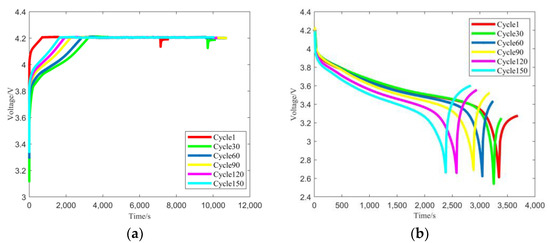 In Figure 8a, the charging process is constant voltage charging, so we have analyzed the discharging process. From Figure 8b, the voltage variation of the B0005 battery at different cycles in the discharging process, it is clear that there is rich degradation information in the voltage between 3.4 V and 3.8 V. In order to avoid information redundancy, the Time Interval of an Equal Discharging Voltage Difference (TIEDVD) is chosen as the time difference corresponding to 3.4–3.8 V, and the 150th cycle is taken as an illustration.