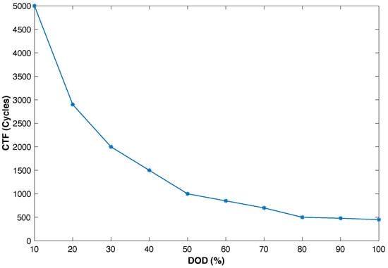 In this paper, a weighted Wh throughput method is used to calculate the lifetime of a lead-acid battery. This method has been employed by many researchers  [,], as it can roughly estimate the battery lifetime by using the SOC as the most significant factor for battery lifetime. The battery has an overall throughput calculated from the manufacturer’s datasheet, which usually provides the relationship between the Cycles to Failure (CTF) and the different DODs as shown in Figure 1. In this study, the employed battery is the Sun Xtender PVX-2580L model (12 V, 3.096 kWh) [].