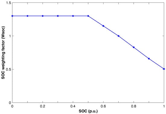 The relationship between SOC and the weighting factor  is shown in Figure 3. For example, using 1 Wh of battery at 0.2 p.u. of SOC is equivalent to 1.3 Wh of the cumulative energy throughput. On the other hand, using 1 Wh at 1 p.u. of SOC is equal to 0.55 Wh of the cumulative throughput. Based on the Figure 3 that shows the relationship between SOC and SOC weighting factor and on Equations (18) and (19), battery life loss mainly depends on SOC and SOC weighting factor ( and ). If the SOC of the battery is kept lower, the battery life loss will be affected (see Equation (19)). Thus, the battery should operate at a high SOC or within its upper SOC limits to extend its lifetime. It has to be noted that this method ignores many influencing factors for simplicity, such as temperature, because temperature can be controlled. Therefore, the battery life loss can be calculated as,
