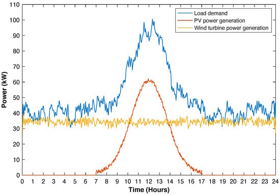 In this study, a standalone microgrid with an industrial load, a WT, a PV and a BESS illustrated in Figure 5 is considered. The daily load demand, PV and WT generations with a 5-min resolution shown in Figure 6, tasken from [], are used to verify the effectiveness of the proposed method. The industrial load has a peak power of 100 kW at 12:30 p.m. The PV generates power between 7:00 a.m. and 5:00 p.m. with a maximum value of 63 kW at noon. The power generated by wind turbines fluctuates around 35 kW throughout the day. The required power from the BESS is obtained based on the mismatch between the load demand and the total power generation. In Figure 7, the BESS’ discharging power is positive and the charging power is negative. The initial SOC is set at 50%. The standalone microgrid project life is set to 20 years. The case parameters used in the optimization are given in Table 1.
