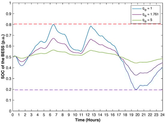SOCs of BESS for  values of 1, 1.761 and 5.