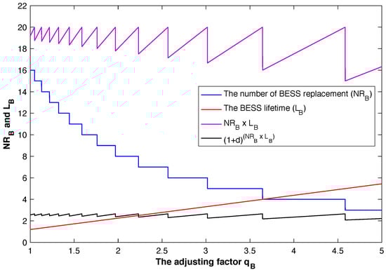 The effects of  on the BESS lifetime and the number of BESS replacements are shown in Figure 11. The number of BESS replacements will decrease step by step with respect to the DOD and the size of the battery in relation to the  factor. However, when calculating the BESS replacement cost in the low  range, the replacement cost is low, and when  is high, the cost of replacing the battery increases. The minimum saw-tooth pattern range is the point where the number of BESS replacements is reduced. The  has a positive effect on the BESS lifetime. The BESS lifetime also increased from 1.2 years to 5.44 years when the  increased from 1 to 5. The number of BESS replacements decreased because the number of replacements remains equivalent even when  is adjusted slightly, such as when  8 and  2.0 and 2.2.