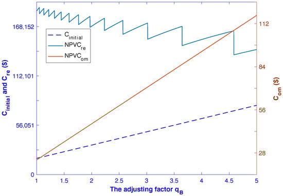 Using the proposed method, the obtained value of US$200,653 was the lowest  at the  of 1.761. This corresponds to the optimal capacity of the BESS of 144.4 kWh. The effects of  on the , the  and the  are depicted in Figure 10. As the  increases, the size of the battery and the cost increase, and the number of replacements decreases. If the battery size is small, the cost of battery replacement is low, but the cost of replacing the battery is high. As the  varied from 1 to 5, in steps of 0.001, the  increased from US$18,419 to US$78,724, and the  increased from US$23.48 to US$117.43. In contrast, the  has downward trends because the  can extend the BESS lifetime and the BESS replacement was reduced.
