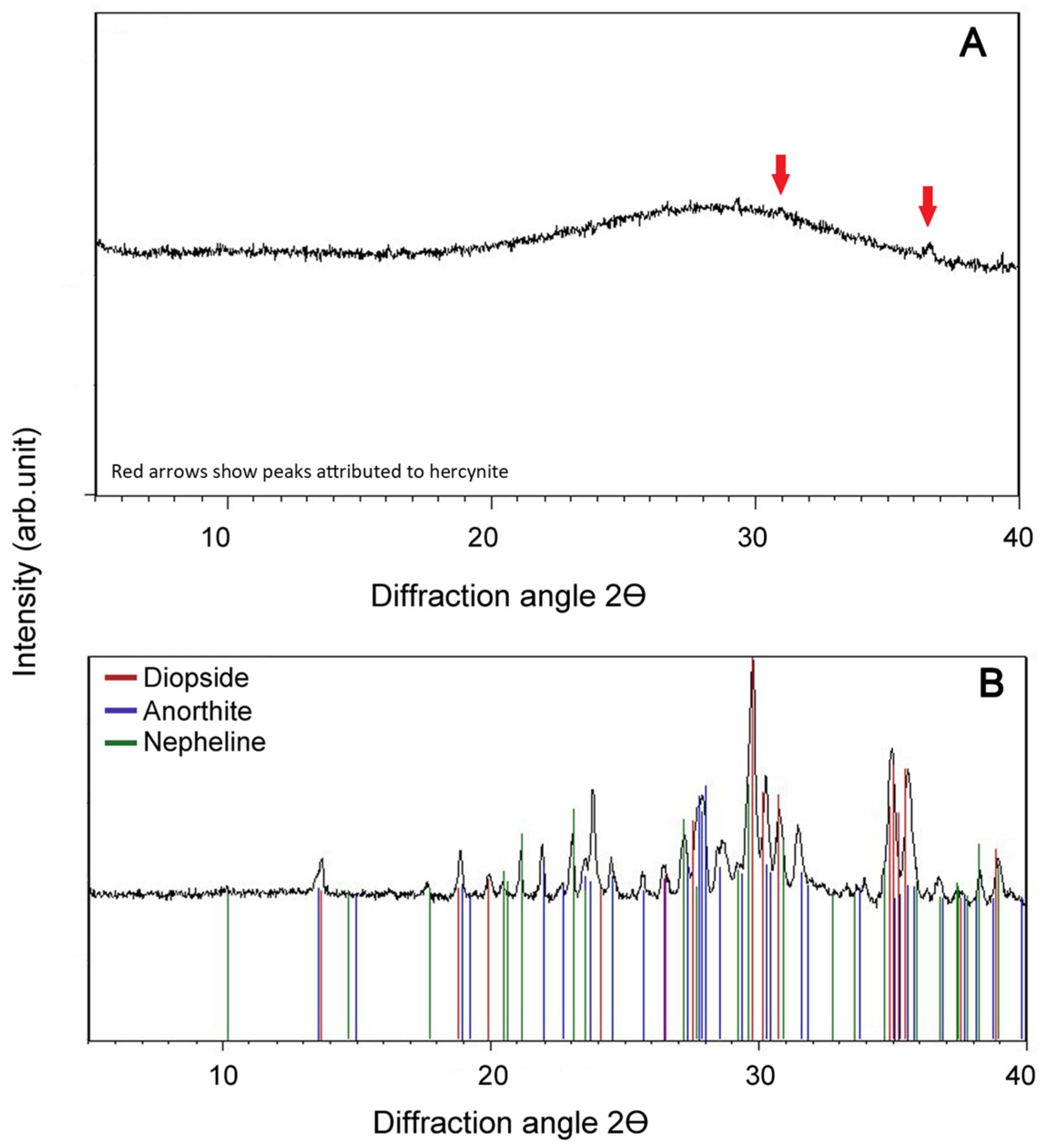 | Flotation muds | Aluminum silicates of Ca, Mg and Fe, amorphous silica, Na-silicates, B2O3, Na2O, SnO2, ZnO | 1000 °C for 30 min | Diopside, Anorthite, Nepheline + minor Wollastonite, Melilite | 53.2–73.4 | 10.1 | This work |