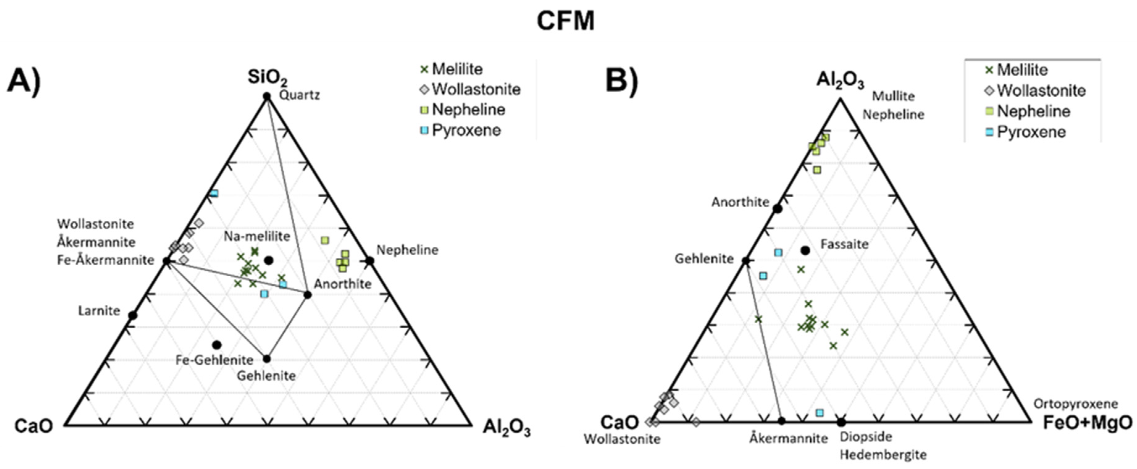 - Dondi, M.; Ercolani, G.; Fabbri, B.; Marsigli, M. Chemical Composition of Melilite Formed during the Firing of Carbonate-Rich and Iron-Containing Ceramic Bodies. J. Am. Ceram. Soc. 1999, 82, 465–468. [Google Scholar] [CrossRef]