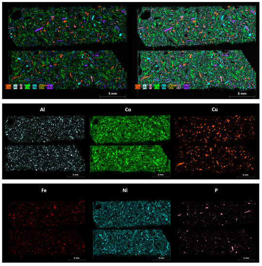 The same polished blocks used for automated mineralogy, Micro X-CT and LA-ICP-MS were re-analysed using an M4 scanning Micro-XRF [29]. The aim of the Micro XRF analysis was to reveal the main components of the black mass samples in terms of the metals of potential economic value, including copper, cobalt, nickel, manganese, zinc, nickel and phosphorus. These maps were also found to be useful in navigating areas of interest in the manual SEM and for comparison with the automated mineralogy results (Figure 13).