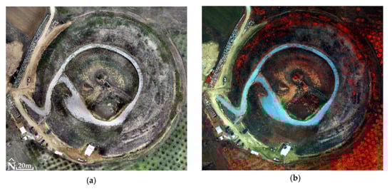 (a) The Ancient Theater of Mieza (40°38′38.6″ N 22°07′21.3″ E): orthophotomosaic (NIR, Green, Blue) without the use of GCPs in the processing of MS images; (b) the Kasta Mound (40°50′21.5″ N 23°51′44.9″ E): orthophotomosaic (NIR, Green, Blue) without the use of GCPs in the processing of MS images.