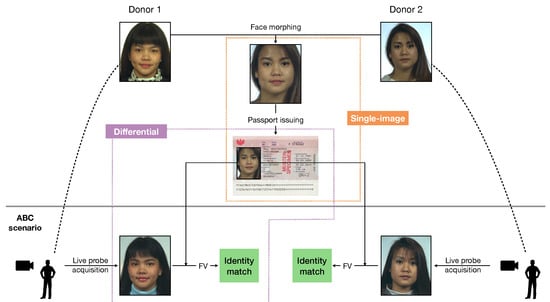 Facilitated by these requirements, advanced FV algorithms can typically perform identity verification rapidly and accurately, but their effectiveness can be compromised if the images stored in eMRTDs contain alterations. A relevant case is represented by face images resulting from morphing operations [], i.e., when two images of different subjects are blended together through geometric operations. In this case, FV algorithms are led to detect a match between the morphed image of the eMRTD and probe images from both subjects, as we illustrate in Figure 1.