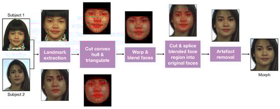 Face morphing consists of merging together two images depicting two different subjects (called donors) into one morphed face image, which contains characteristics of both subjects. This process generally involves several rule-based procedures and, although variants can be devised [], we refer to the work in [] and visually summarize the main steps in Figure 2.
