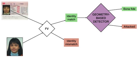 The analyzed geometry-based detectors operate in the presence of the eMRTD and the probe live image depicting the physical subject. As explained in Section 1, the detection is intended to be applied after the FV outcome if an identity match is detected.