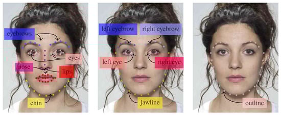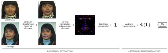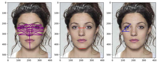 - We compare the performance of different transformations of the full set of facial landmarks, including feature representations previously proposed the literature [,] and geometric features stemming from findings in facial anthropometry.