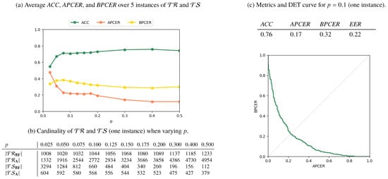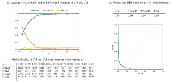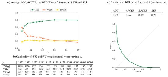 Results for the AMSL-only, FERET-only, and Mixed scenarios are reported in Figure 6, Figure 7 and Figure 8, respectively. In Figure 6a, Figure 7a and Figure 8a, we plot the metrics ACC, APCER, and BPCER for different values of p. Since step a of the splitting procedure involves a random choice of a fraction p of subjects (for which the images are then included in ), the metrics are averaged over 5 different splitting instances for validation. Figure 6b, Figure 7b and Figure 8b report the cardinality of the resulting training and testing groups for each class on a single splitting instance, for which we report in Figure 6c, Figure 7c, Figure 8c the DET curve and the performance metrics at .