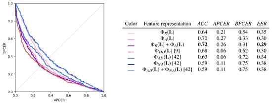We report the results for the case of in Figure 10. On the left, the DET curves for the different transformations are reported, and for each of them, the performance metrics are reported on the right. Higher ACC and EER are obtained by the anthropometry-based transformations and . In general, the angle-based features in are more informative than the ratio-based ones in , although their dimensionality is lower than all the other considered transformations. also has competitive performance, but its APCER and BPCER are strongly unbalanced. , , and their combinations yield less accurate classifications.