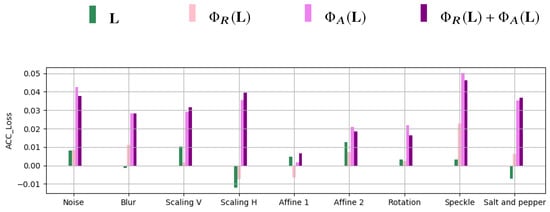 In each case, we measure the performance loss with respect to the baseline case, where neither training nor testing underwent any processing. If ACC is the accuracy in the baseline case and ACC is the accuracy when a certain processing is applied to the testing set, we calculate the accuracy loss as