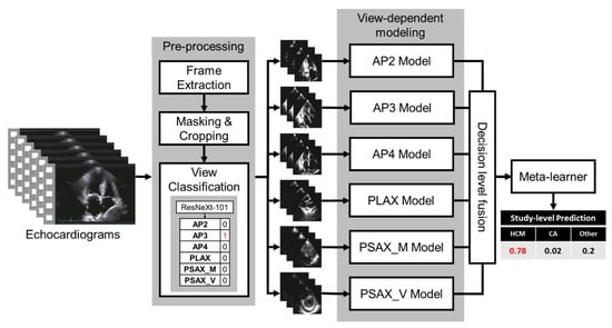 Our established automatic deep-learning framework allows the input of the entire echo study. After each view is identified by the view classifier, the probability output generated by each individual view-dependent model is aggregated by the meta-learner to produce the final fusion results. Compared to a video-based model [], a frame-based model is more computationally efficient, can expand the size of the training dataset, and tolerates noisy frames in the classification process as they are aggregated by majority voting.