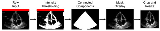 Preprocessing echocardiogram frames. Each image shows the output of the processing, and text above shows the process names. The red bars were used to anonymize the patient information for the figure.