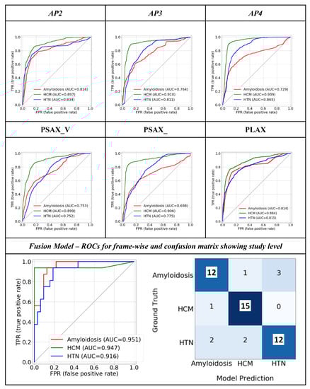 While the application of deep learning is rapidly growing in medical literature, there are relatively fewer studies that have incorporated a fusion architecture []. A fusion architecture has the potential to improve the overall performance of deep learning models by associating multiple input channels [,]. This kind of approach is particularly feasible when being applied to TTE studies, as the images were obtained according to standardized views suggested by the guidelines [,]. Duffy et al. reported a model using the AP4 views as the input and reached an AUC of 0.83 for CA, and an AUC of 0.98 for HCM [], while our proposed fusion model successfully pushed the AUC of CA to > 0.90 AUROC.
