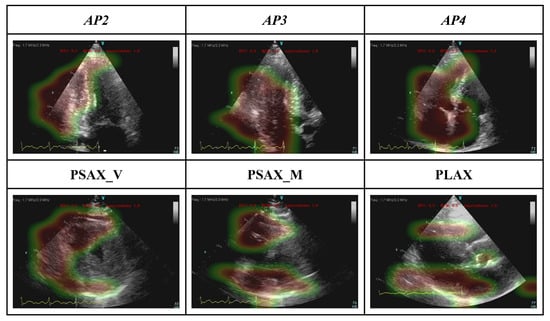Figure 4 demonstrated the GRADCAM heatmap of areas with greater importance for the model decision (red- more important, green- less important) on each echo view of a representative case.