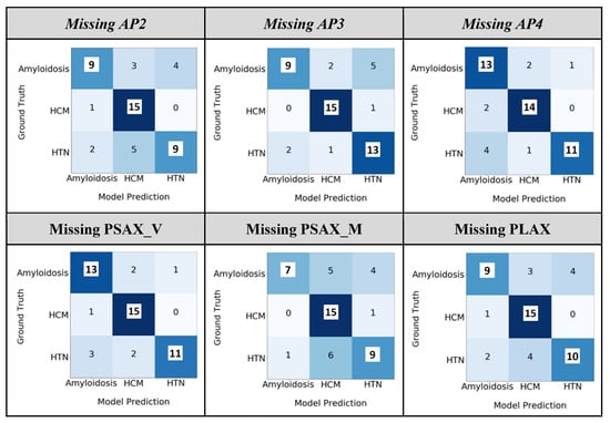 The view-level ablation study (Figure 5) shows that the model also obtained an average 76.3% [68–93%] true positive rate if a single view is missing and is able to gather the information correlating other existing views. Missing apical window (AP) views lead to a greater drop in the model performance than short-axis views, and the primary difference is observed in CA and HTN/other categories.