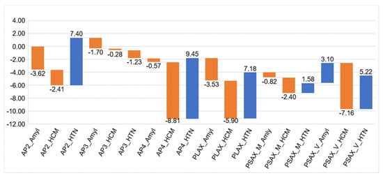 The coefficients of the meta learner for the final decision. Each model has three output channel which correspond to the three classes. Apical 2-chamber (AP2), 4-chamber (AP4), and parasternal long-axis (PLAX) views had more contributions to the final decision of the HTN/other class. Apical 4-chamber view (AP4), parasternal short- (PSAX, mid LV level) and long-axis views were more informative for the class of HCM. For cardiac amyloidosis, apical 2 chamber (AP2), parasternal long axis and parasternal short axis (mid LV level) were more informative.