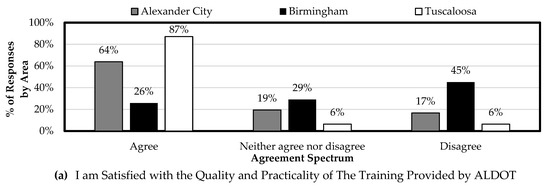 By running a Chi-Square test, it was discovered that there is a statistically significant relationship (p-value < 0.05) between ALDOT area and job title/class, which can potentially influence training needs across the three areas. Figure 1e provides a comparative analysis of job titles or classes across the three different areas: Tuscaloosa Area, Birmingham Area, and Alexander City Area. TMT II category shows a substantial presence in Birmingham Area, accounting for 47% of Birmingham respondents, followed by 42% of Alexander City responses and 25% in Tuscaloosa. In contrast, the TMT I category is more evenly distributed within Tuscaloosa Area and Birmingham Area, showing close percentages (29% and 31%, respectively); however, none of Alexander City respondents were classified as a TMT I. The TMT III category shows a higher concentration in the Alexander City Area at 31%.