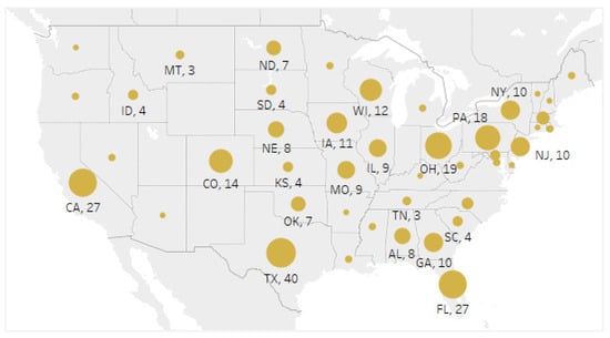 Locations of skid steer-related fatalities and severe injuries, 2015–2020 (Magnitude of circles are proportional to the number of injuries).