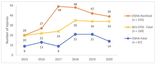The yearly number of skid steer injuries from the OSHA dataset (fatal and nonfatal) and BLS-CFOI (fatal) are shown in Figure 2. BLS-CFOI data were extracted from the Census of Fatal Occupational Injuries database using their one-screen data search []. Since we did not have access to the CFOI microdata, we could not determine exactly how many overlapping cases were between CFOI and OSHA fatal cases. However, we assumed that all of the OSHA cases were included in the CFOI data since CFOI includes all fatal work injuries, regardless of whether the victim was working in a job covered by the OSHA. Further discussion is provided in the Discussion section.
