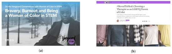 Artefacts from the #VanguardSTEM (a) live web series and (b) resource-driven curated digital content. Both examples make clear the standpoint of our materials and the audiences for whom they are intended. Anyone is welcome in our hyperspace, but we make clear that our hyperspace exists to center and highlight the experiences of women, girls and non-binary people of color in STEM.