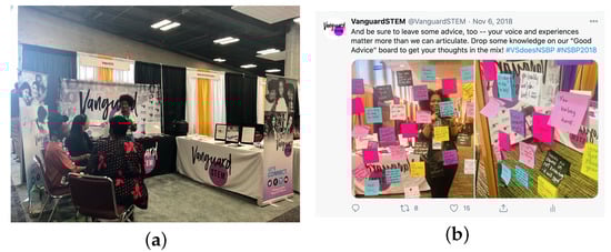The #VanguardSTEM Conference Crashing initiative brought our previously digital-only content into the (a) real world to take up physical space and materialize our hyperspace at STEM conferences. We used the physical space to build up a “Good Advice” board (b) where visitors to our booth could leave advice or get advice, thus contributing to STEM identity of building alignment and a sense of connection to the community of women and non-binary people of color attending the same conference.