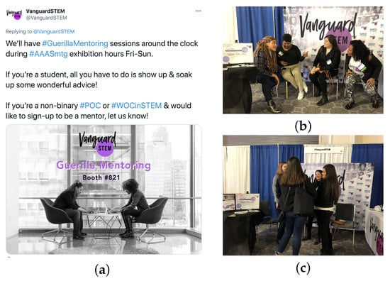 We also developed in-situ mentoring through our “Guerilla Mentoring” campaign (see Figure 4). Here we used the strength of our virtual connections to multiply our physical connections. We tweeted, using the relevant conference hashtag (see Figure 4a), to solicit mentors at the conference who identified as women and non-binary people of color to volunteer as mentors for emerging women and people of color in STEM “on the spot.” We view this particular deployment of mentoring to be incredibly important to our community as they are navigating the conference in real-time (see Figure 4b). Mentees might bring up questions about a request for an interview they were offered at the next booth, or ask for someone to review the opening few lines of the poster or talk they are presenting or ask more long-term questions. Also central to our Guerilla Mentoring initiative is that we showcase the iSTEM framework through the embodiment of our mentors; they were there, existing in real-life as STEM experts that have both the situated knowledges and scientific expertise to advise the #VanguardSTEM community in the middle of a STEM conference. Conference Crashing and Guerilla Mentoring render visible and central the intersectional STEM expertise of our community in the real-world. We were particularly moved when participants at AAAS pointed out that they did not realize there were so many women of color in STEM at the conference, until they came to our booth and saw so many of us materialize in one physical place.