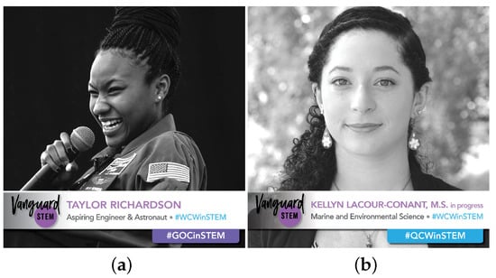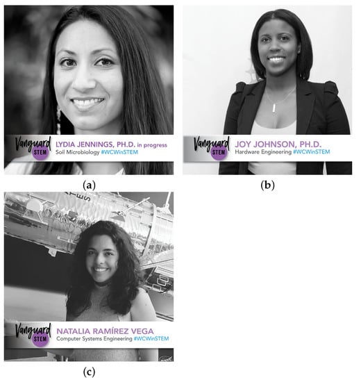Above are three women of color in STEM (now-Dr. Lydia Jennings (a), Dr. Joy Johnson (b) and Natalia Ramírez Vega (c)), of the more than 100 “Woman-crush Wednesday in STEM” (#WCWinSTEM) features written and published by #VanguardSTEM over the last four years. These medium-length, science-driven features of women of color in STEM are often their first publicly available, in-depth articles about their STEM interests and identities.