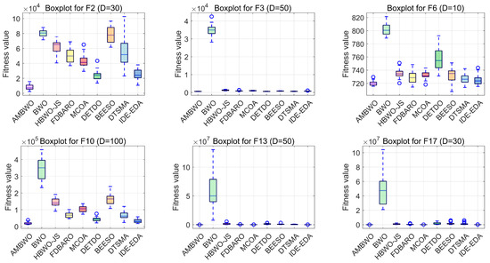 The boxplots of AMBWO and other competitors based on CEC2017 (D = 50).