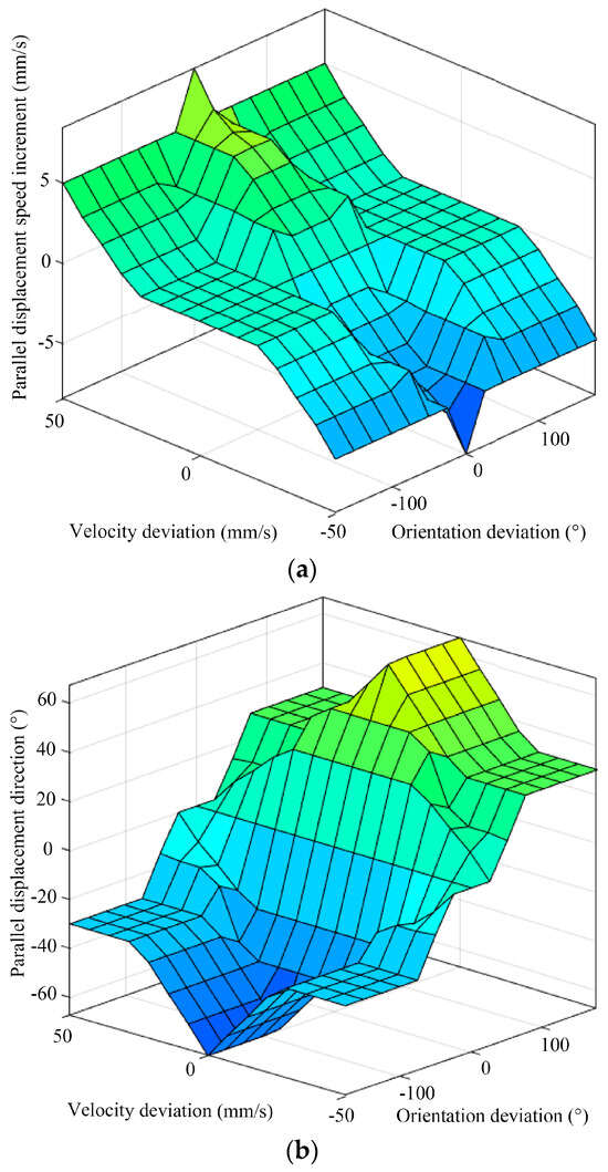 The fuzzy controller’s input and output variables are fuzzified as follows. For the input variables, the orientation deviation (denoted as T) spans a range of [−180°, 180°] and is categorized into five groups: large right turn (RRT), small right turn (RT), middle (M), small left turn (LT), and large left turn (LLT). Similarly, the velocity deviation (V) is defined within the range of [−50 mm/s, 50 mm/s] and is associated with five groups: large deceleration (LLV), small deceleration (LV), middle (M), small acceleration (HV), and large acceleration (HHV). For the output variables, the parallel displacement speed increment (S) ranges from −10 mm/s to 10 mm/s and is categorized into five groups: large deceleration (LL), small deceleration (L), middle (M), small acceleration (S), and large acceleration (SS). Moreover, the parallel displacement direction (D) is similarly defined within the range of [−180°, 180°] and fuzzified into five groups: large right shift (RR), small right shift (R), middle (M), small left shift (L), and large left shift (LL). Finally, the rotational speed of the hexapod robot (R), ranging from 30°/s to 30°/s, is fuzzified into five groups: fast right turn (RR), slow right turn (R), middle (M), slow left turn (L), and fast left turn (LL).