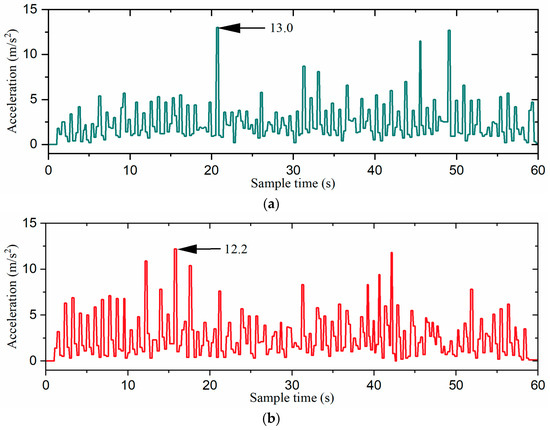 The acceleration curves of the robot: (a) the direct gait switching strategy, (b) the fuzzy-inference-based gait switching strategy, and (c) the combined omnidirectional and fuzzy-inference-based gait switching strategy. The acceleration is the absolute value of the inertial acceleration.