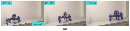 Snapshots of each attitude control algorithm for the slope-climbing experiments, with the body parallel to the horizontal plane, are shown in Figure 22. As can be seen from the figure, both strategies could enable the hexapod robot to keep its body parallel to the horizontal plane and climb from the bottom to the top of the slope.