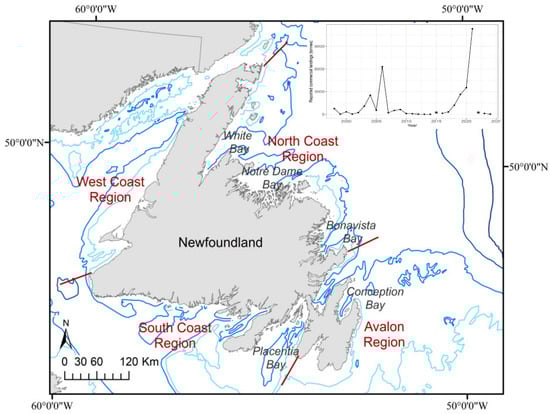 Map of the island of Newfoundland, Canada, identifying key regions in red (West Coast Region, South Coast Region, Avalon Region, and North Coast Region) used to help understand squid ecology and squid fisheries. Key bays of interest are also identified. The inset depicts reported northern shortfin squid (Illex illecebrosus) commercial landings from the province of Newfoundland and Labrador (NL) from 1998 to 2024. Asterisks denote years when landings were greater than zero but could not be shown due to privacy policies.