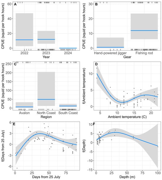 Partial effect plots from a general additive model (GAM) predicting catch per unit effort (number of squid per hook hours fished) as reported in the Squid Recreational Fishing Survey from 2022 to 2024, based on (A) year, (B) gear, (C) region in Newfoundland and Labrador, Canada, (D) ambient temperature (°C), (E) number of days from first recorded recreational fishing trip (25 July), and (F) depth (m). Ambient temperature, number of fishing days, and depth were reported as functional responses for ease in viewing. The grey shaded area represents the 95% confidence interval for the fitted smooth function.