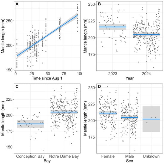 Partial effect plots from a general additive model (GAM) with a Gaussian distribution predicting mantle length (mm) of northern shortfin squid (Illex illecebrosus) based on (A) commercial fishing date (calculated as time since 1 August), (B) year, (C) bay, and (D) sex from samples collected from commercial index harvesters off the island of Newfoundland, Canada. The grey shaded area represents the 95% confidence interval for the fitted smooth function.